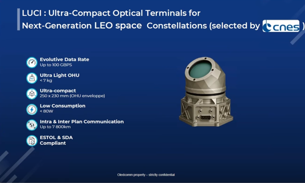 In partnership with the French Space Agency (CNES), Oledcomm is developing LUCI (Liaison Ultra Compact Inter Satellite). This is not just for inside the satellite, but for talking between them.